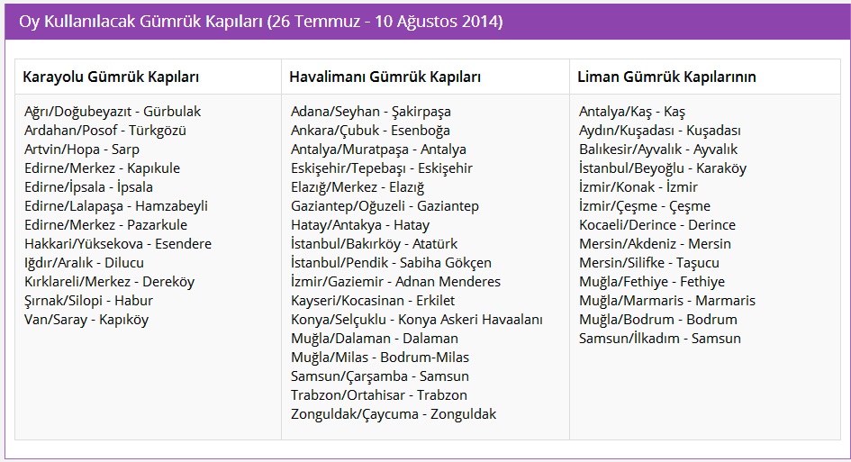 Bilindiği üzere, Cumhurbaşkanlığı seçimlerinde oy kullanmak üzere Başkonsolosluğumuza adres beyanında bulunmuş ve yurtdışı seçmen kütüğüne kaydolmuş vatandaşlarımız, oylama tarihinde Türkiye’de bulunmaları halinde Türkiye’deki gümrük kapılarında (birinci tur için 26 Temmuz-10 Ağustos; ikinci tur için 17-24 Ağustos) oy kullanabileceklerdir. YSK tarafından açıklanan güncel “Oy Kullanılacak Gümrük Kapıları” listesi ekte sunulmuştur. Sözkonusu listeye YSK’nın ysk.gov.tr internet sitesinden de ulaşılması mümkündür.