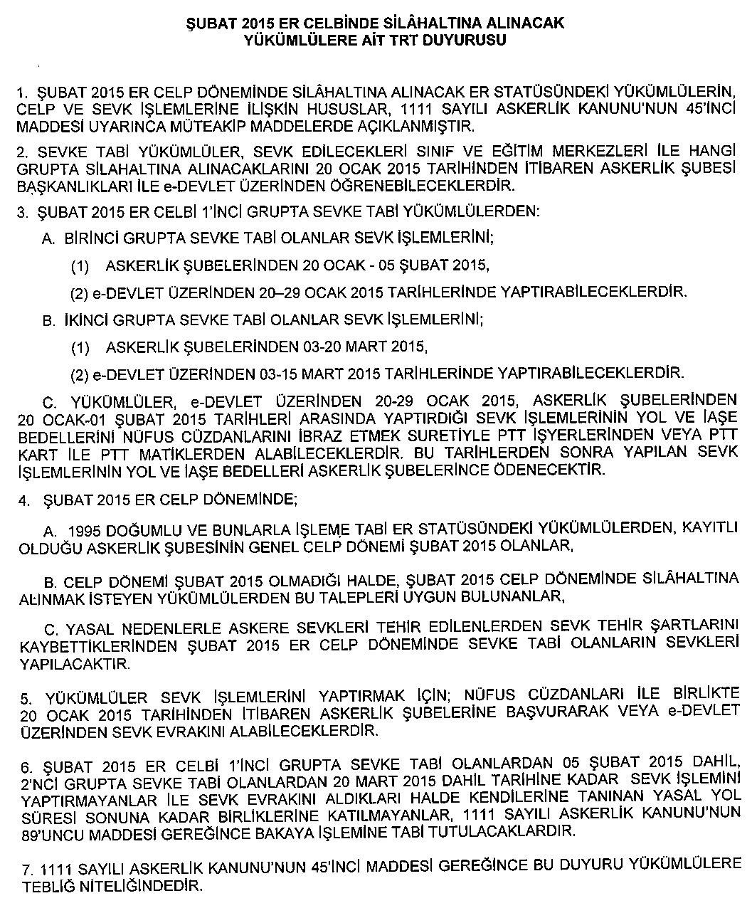 "ŞUBAT 2015 ER CELBİNDE SİLAHALTINA ALINACAK YÜKÜMLÜLERE AİT TRT DUYURUSU" ekte sunulmuştur.