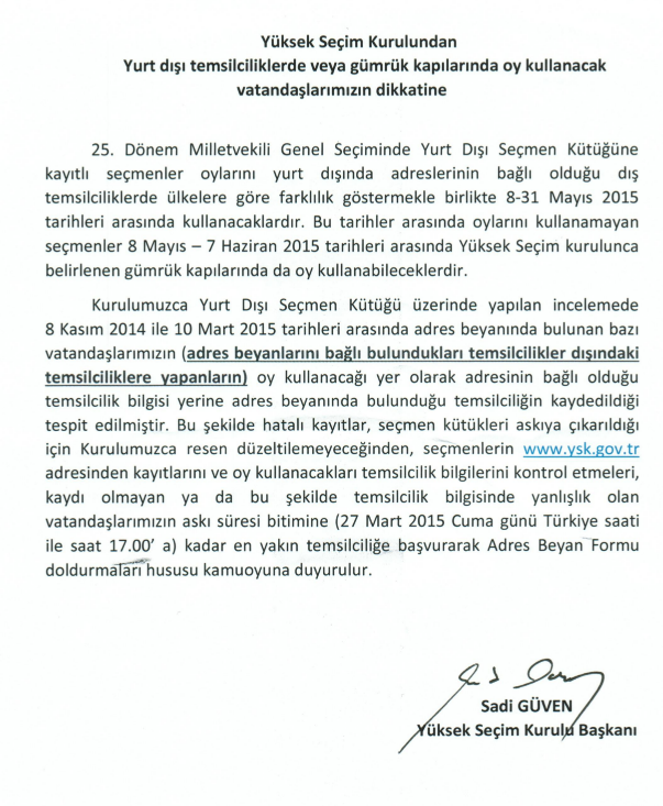 Yüksek Seçim Kurulu'ndan (YSK) alınan ve bir örneğiekte sunulanduyuru metninde; anılan Kurul tarafından Yurt Dışı Seçmen Kütüğü üzerinde yapılan incelemede 8 Kasım 2014 ile 10 Mart 2015 tarihleri arasında adres beyanında bulunan bazı vatandaşlarımızın (adres beyanlarını bağlı bulundukları temsilcilikler dışındaki temsilciliklere yapanların) oy kullanacağı yer olarak adresinin bağlı olduğu temsilcilik bilgisi yerine adres beyanında bulunduğu temsilciliğin kaydedildiğinin tespit edildiği, bu şekildeki hatalı kayıtların, seçmen kütükleri askıya çıkarıldığı için YSK tarafından resen düzeltilemeyeceğinden, seçmenlerin www.ysk.gov.tr adresinden kayıtlarını ve oy kullanacakları temsilcilik bilgilerini kontrol ederek, kaydı olmayan ya da bu şekilde temsilcilik bilgisinde yanlışlık olan vatandaşlarımızın askı süresi bitimine (27 Mart 2015 Cuma günü Türkiye saati ile saat 17.00' a) kadar en yakın temsilciliğe başvurarak Adres Beyan Formu doldurmaları gerektiği belirtilmektedir.