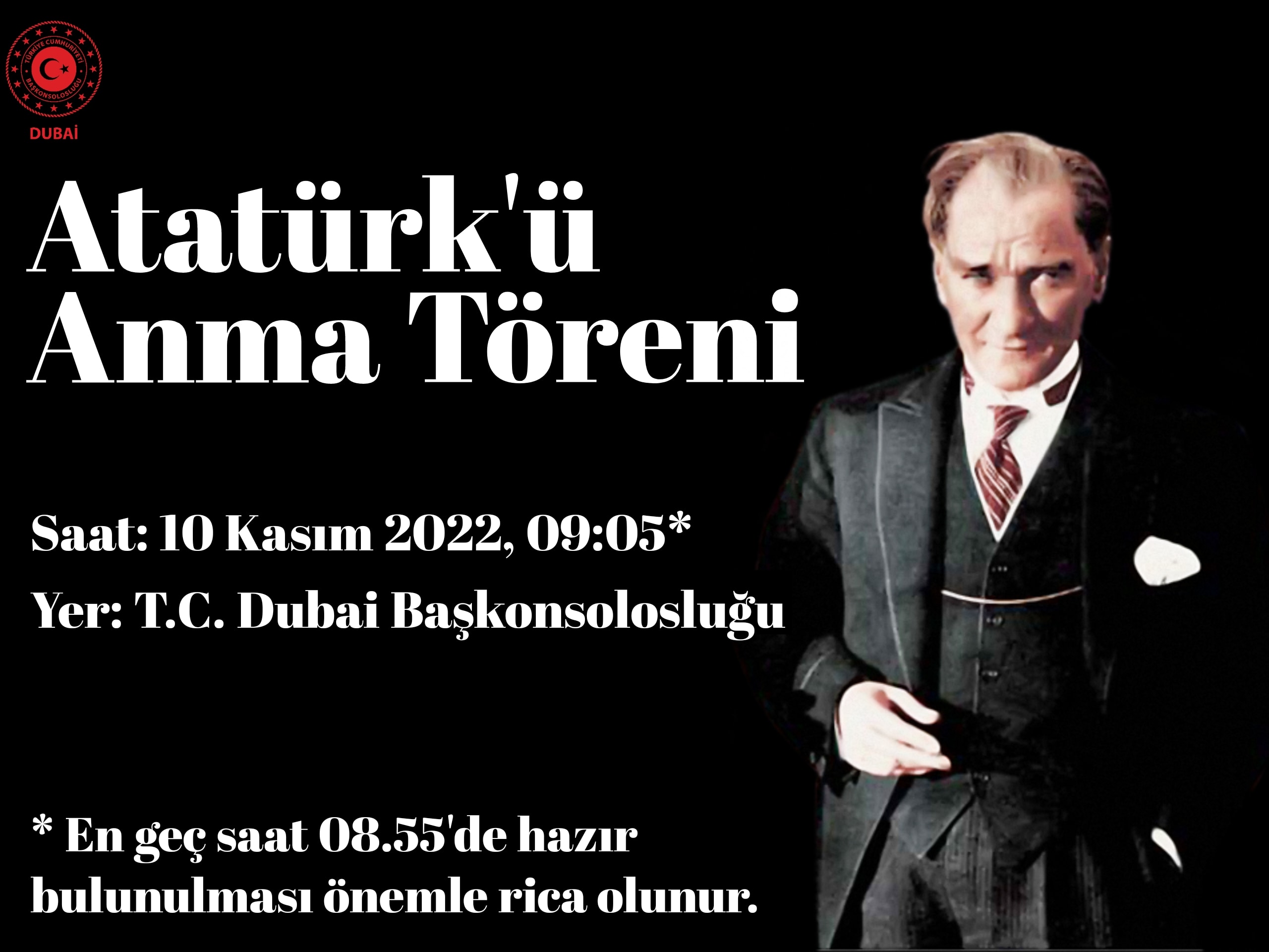 Büyük Önder Mustafa Kemal Atatürk'ü ebediyete intikalinin 84. yıldönümünde anmak üzere, 10 Kasım günü 09:05’te Başkonsolosluğumuzda tören düzenlenecektir.