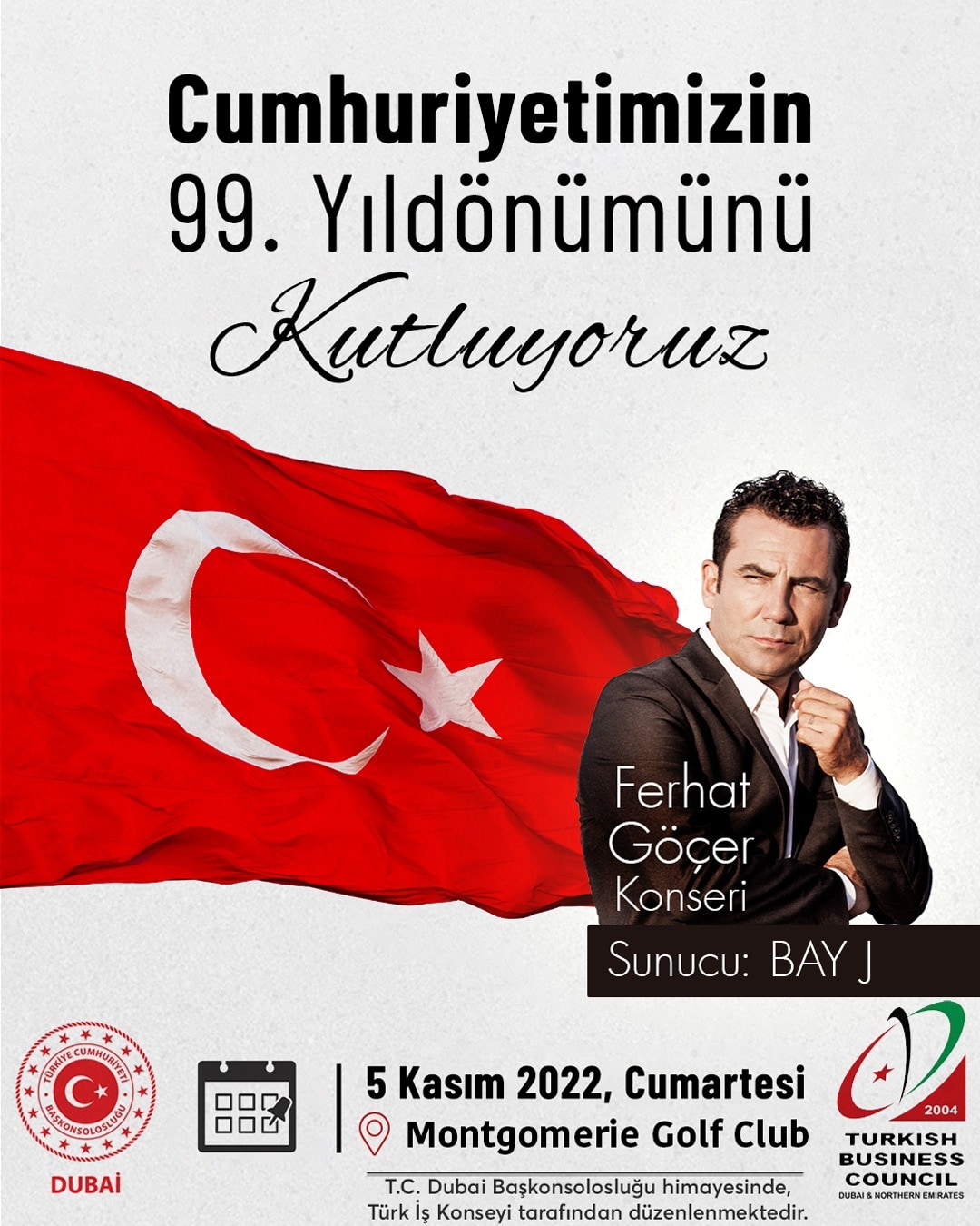 29 Ekim Cumhuriyet Bayramımızın 99. yıldönümünü vesilesiyle, Başkonsolosluğumuzun himayesinde, Dubai Türk İş Konseyi tarafından, 5 Kasım 2022 Cumartesi akşamı Montgomerie Golf Club’da vatandaşlarımıza yönelik bir kutlama etkinliği düzenlenecektir.